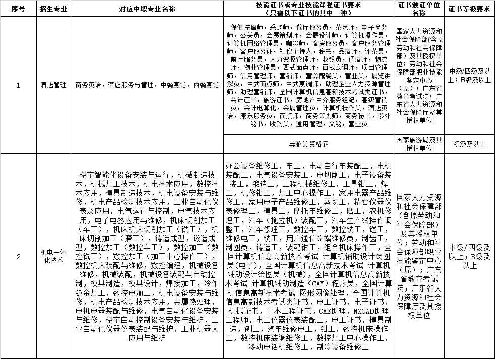 2、中职阶段所学专业与我校招生专业直接相关,并取得与招生专业相关的职业资格技能等级证书。职业资格技能等级证书原则上为国家职业资格中级及以上技能等级证书,或省教育考试院主考的专业技能课程B级及以上证书,或省级以上人力资源和社会保障部门主考(或授权)的中级及以上技能等级证书。