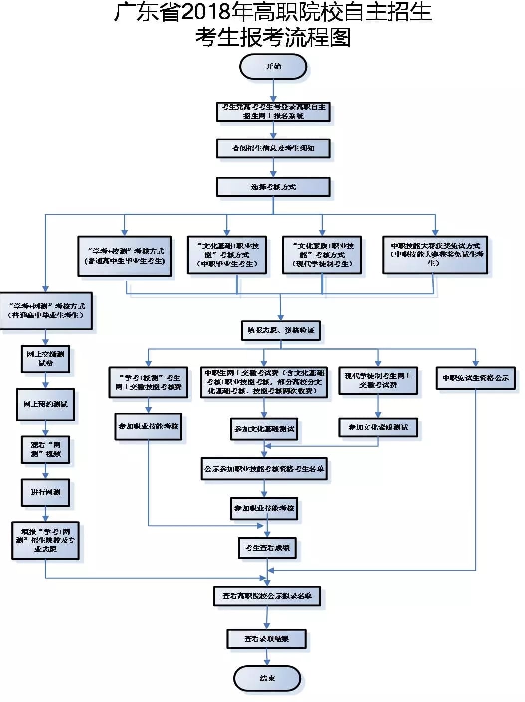 2、拟报考我校“学考+网测”考核方式专业的考生须在规定时间内登录“广东省2018年高职院校自主招生网上报名系统”(网址:http://www.eesc.com.cn/gzks)选择相应考核方式,先网上缴费后进行预约测试,按照预约时间在网上观看专业大类视频及完成测试。测试完成后可打印“网测”成绩单,并在规定时间内根据本人“网测”成绩情况,选择相匹配的专业志愿进行填报。