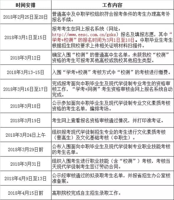 2、参加我校“学考+校测”考生请于3月1日-3月10日登录“广东省2018年高职院校自主招生网上报名系统”(网址:http://www.eesc.com.cn/gzks)报考,3月12日学校公布获“学考+校测”的考生资格名单,考生在3月13日-3月15日完成缴费确认报考。3月13日-3月15日未获本校“学考+校测”资格的考生可报其他高校或我校其他招生类型。